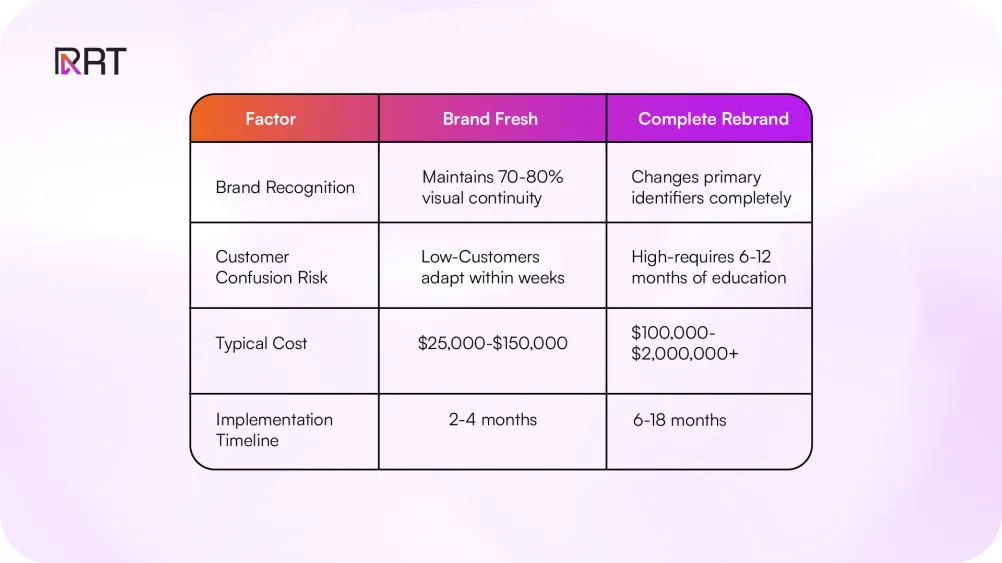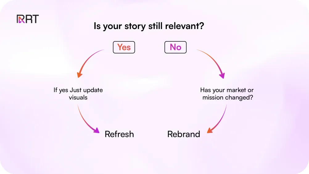 A refresh works when your story still connects but your visuals or tone feel out of step with today’s audience. A complete rebrand, on the other hand, comes into play when your business has evolved so much that the old identity no longer fits. Maybe you’ve shifted industries, entered new markets, or your brand promise has changed entirely.